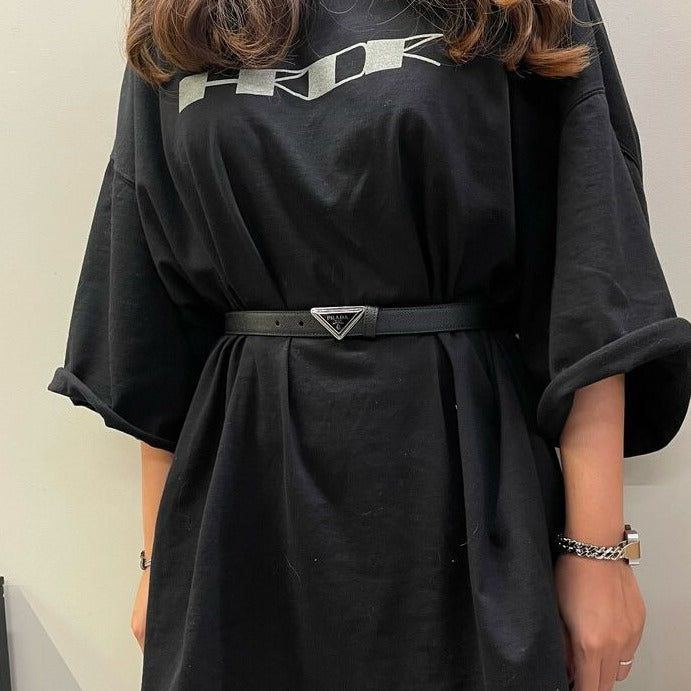 Keywords: SAFFIANO BELT, Unique Design, Modern Aesthetic, Enameled-Metal Triangle Logo, Iconic Flair, Minimalist Design, Timeless Fashion, Distinctive Accessory.